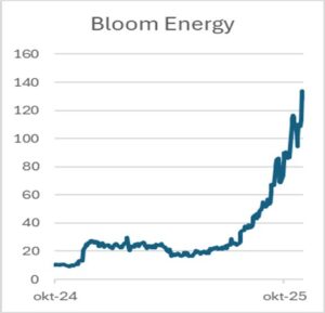 Samen met Co. Chair Jay Y Lee van Samsung Electronics en Chung Euisun van Hyundai Motor. Alle drie gekleed zoals dat hoort in een dergelijk restaurant in vrijetijdskleding. In de spiegeling van de ruiten valt te zien dat het niet toevallig is.  Vele fotografen leggen dit beeld vast. Maar dat is nog niet alles. Volgens de financiële nieuwsdienst Bloomberg zaten de drie te eten bij fast food keten Kkanbu Chicken. Dit bedrijf is niet beursgenoteerd maar wel rivaal Kyochon F&B Co. Dat aandeel steeg op de Koreaanse beurs met meer dan 20% na publicatie van de foto. Ook Cherrybro de maker van kipproducten steeg met 30%. De verklaring als de topondernemer kip gaat eten moet je dat ook doen en dus zal de omzet van fast food restaurants toenemen waarvan leveranciers dan weer profiteren. Volgens de Financial Times gaat de AI (kunstmatige intelligentie) bubbel nu haar “Fried Chicken” fase in. Immers de koersstijging van Nvidia komt door AI. En blijkbaar stijgt nu alles dat ook maar de geringste connectie heeft met AI. Ook al is het een kippenproducent. Een ander voorbeeld is het Amerikaanse Bloom Energy. Deze produceert brandstofcellen. En energie is belangrijk voor AI. De koers van Bloom is dit jaar met bijna 500% gestegen waardoor de koerswinstverhouding uitkomt op meer dan 1800. Oftewel pas over 1800 jaar (bij gelijke winst) heeft de belegger zijn geld terug. Argumenten genoeg dat ook deze bubbel een keer zal barsten. De geschiedenis heeft vele verhalen over bubbels. Van de bekende tulpenbollen tot bijvoorbeeld de grondprijzen in Tokyo. In 1986 waren die zover gestegen dat het keizerlijk paleis meer waard was dan geheel Californië. De Japanse index de Nikkei-225 bereikte een recordstand van 39.000. Drie jaar later in 1992 barstte zoals dat heet de vastgoedbubbel. In 2003 stond de index op 8.000. Veel analisten zien een dergelijk scenario ook voor AI. Er komt een tijd dat koersen waaronder die van Nvidia fors zullen gaan dalen. Alleen het probleem is dat toen Nvidia de helft waard was, ruim een jaar geleden, dezelfde verhalen er waren. Het voorspellen dat bubbels zullen barsten is eenvoudig. Het is onmogelijk om te voorspellen wanneer dat zal zijn. “Fried chicken” indicatoren zijn daar niet van invloed op. Bovendien kunnen bubbels barsten maar na verloop van tijd kan het allemaal toch weer goed komen. Dat voorbeeld zien we aan de Nikkei-225. Afgelopen juni werd het record uit de tachtiger jaren verbeterd en kwam de index uit op 40.000. Vrijdag sloot deze index alweer 30% hoger op 52.000. Natuurlijk het is voor Japanse beleggers lang wachten geweest. Maar beleggen is geen daghandel.