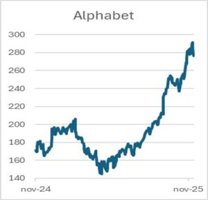 De onrust de afgelopen dagen kwam vooral door AI aandelen (zie FT11VS-2024). De grote vraag op dit moment is of alle investeringen uiteindelijk wel rendabel zullen zijn. Zoals hier vaker vermeld is in de geschiedenis vaker gebleken dat grote technologische veranderingen niet altijd winstgevend zijn. Wellicht kwam het antwoord op de vraag wel na dat de Amerikaanse beurzen waren gesloten. Berkshire Hathaway, het beleggingsfonds van Warren Buffett, maakte toen haar portefeuille bekend zoals die eind september was samengesteld. Er was een duidelijke verrassing namelijk Alphabet waar onder andere Google toe behoort. Het was de grootste aankoop in het 3e kwartaal van Berkshire. En redelijk opvallend omdat Buffett in zijn lange carrière altijd wegbleef van technologiefondsen. Onder het eenvoudige principe dat hij het allemaal niet begreep en dat je er dan ook niet in moet beleggen. Dat gold niet voor Apple dat hij in 2016 met koersen rond de $25 (nu $270) begon te kopen. De ratio erachter was dat Apple geen technologiefonds was maar een consumentenaandeel. Buffett heeft een voorliefde voor consumentenaandelen zoals Coca-Cola. Immers overal op de wereld kan men wel Coca-Cola bestellen. Die lijn doortrekkend kan dat ook worden gesteld van Apple. Fervente gebruikers zijn nog altijd bereid om telkens de nieuwste toestellen vaak tegen een hogere prijs te kopen. Maar Alphabet is wel degelijk een technologiebedrijf. Het investeert ook zwaar in datacentra om de toenemende vraag naar AI het hoofd te kunnen bieden. Blijkbaar vind Buffett dat er wel degelijk toekomst in zit en dat investeren in dit aandeel zeker rendabel kan zijn. Want Berkshire kocht dit aandeel op historische hoge niveaus. Een verklaring voor de koop kan zijn dat hij binnenkort aftreedt. En hij wil dan ook zijn opvolgers, die wellicht met het idee zijn gekomen, niets in de weg leggen. Daar staat tegenover dat hij ook niet het heeft tegengehouden en derhalve ook wel in het idee gelooft. In ieder geval steeg de koers van het aandeel nabeurs met 3%. En kan het de historisch hoogste koers aller tijden deze week weer bereiken. Dat kan rust brengen in de koersen van diverse AI aandelen. Echter veel hangt natuurlijk af van de cijfers van Nvidia die woensdag de 19e november zullen worden gepubliceerd. En zoals altijd gaat het niet over de resultaten die geboekt zijn maar over de vooruitzichten. Dat de vraag groot is naar de producten van Nvidia is wel duidelijk. Probleem is of alle toeleveranciers wel in staat zijn te leveren. Dat bleek afgelopen week wel uit de cijfers van datacenterbedrijf Coreweave. De omzetprognose moest worden bijgesteld. De belangrijkste reden was dat men niet tijdig de nodige producten kan krijgen om nieuwe datacentra te openen. Of dat ook het probleem kan gaan worden rondom Nvidia zal deze week blijken.  Om Steve Sedgwick te herhalen: elke dag is belangrijk voor de aandelenmarkten.